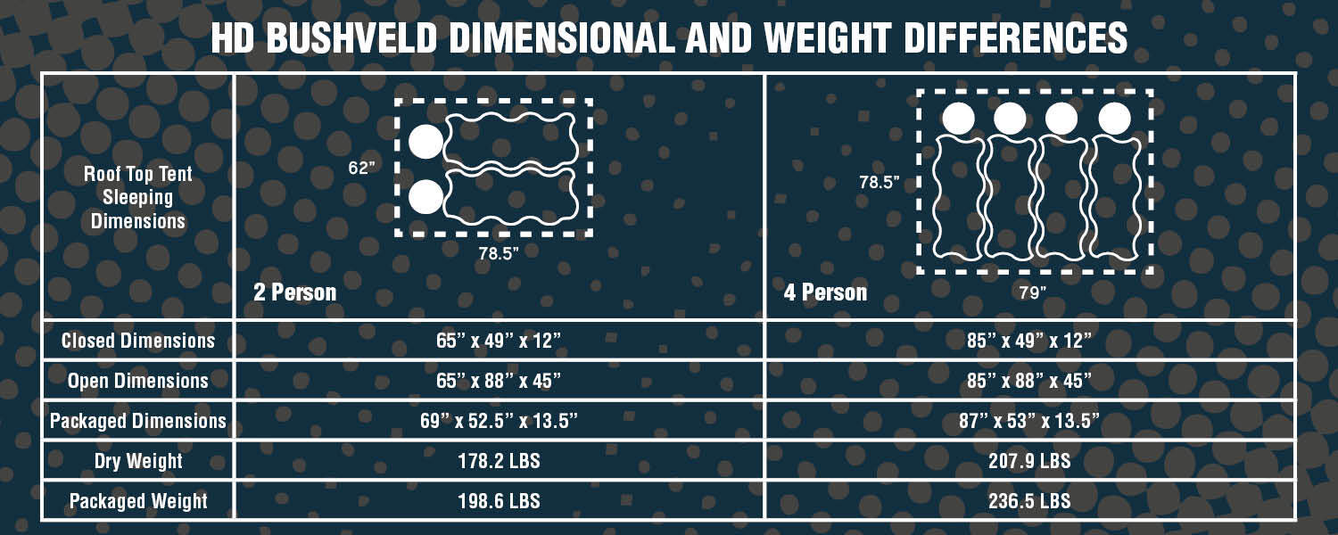 The Overland Vehicle Systems HD Bushveld Hard Shell Roof Top Tent is a 4-Season cantilever designed Roof Top Tent. The Bushveld Name is based on a sub-tropical woodland ecoregion of Southern Africa. The Overland Vehicle Systems HD Bushveld Hard Shell Roof Top Tent has one of the largest sleeping areas on the market today. The stylish one-piece Hard Shell shell is aerodynamic and simple to use with easy to use latches. Once the Roof Top Tent is released, the top will open and then flip the bottom out to extend the mattress out. The HD Bushveld is designed to provide plenty of space for the entire family.