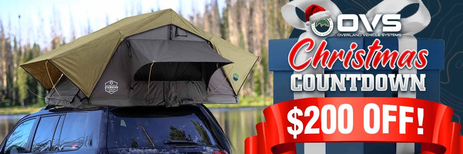 We all know that one of the best parts of any outdoor adventure is coming home to a comfortable bed at the end of the day. But what if you want your home to be a Roof Top Tent for your adventure? That's why we added many functional features in our Overland Vehicle Systems Nomadic 3 Standard Roof Top Tent. The Nomadic 3 Standard Roof Top Tent is built tough and can withstand all kinds of weather conditions. The toughness comes with oversized Roof Top Tent Body Poles and integrated "V" Strength Ridges in the Window Rods, both help to improve the performance in windy conditions. All our Heavy Duty Buckles are ergonomic for easier synching of your Roof Top Tent. Plus, it comes with a comfortable 3" mattress on top of an insulated base so you can sleep soundly through the night. Both the Roof Top Tent Rainfly and Roof Top Tent Body have an integrated Skylight. So, whether you're hitting the road in your SUV, Jeep Wrangler, Jeep Gladiator, Truck or Trailer, make sure you bring along the best Roof Top Tent on the market. The Nomadic 3 Standard Roof Top Tent will make all the difference on your next outing. We know you'll appreciate the easy to install, deploy, stow, 4 season weather protection, and functional design that makes this the best Roof Top Tents. OVS follows Federal Motor Vehicle Safety Standards and uses 302 Certified Fabric.