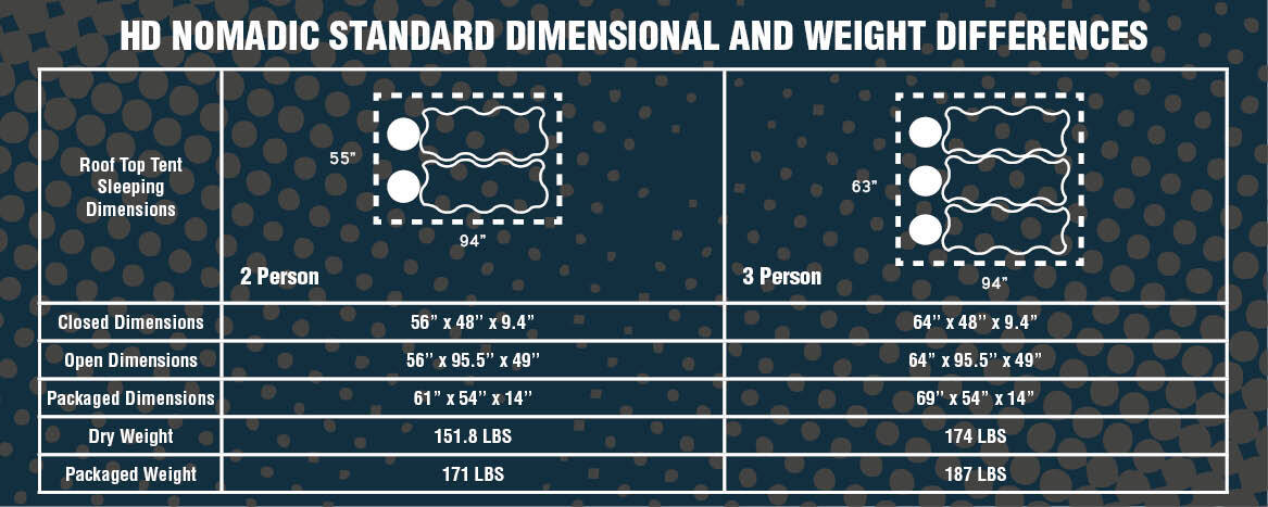 We all know that one of the best parts of any outdoor adventure is coming home to a comfortable bed at the end of the day. But what if you want your home to be a Roof Top Tent for your adventure? That's why we added many functional features in our Overland Vehicle Systems HD Nomadic Standard Roof Top Tent. The HD Nomadic Standard Roof Top Tent is built tough and can withstand all kinds of weather conditions. The toughness comes with oversized Roof Top Tent Body Poles and integrated "V" Strength Ridges in the Window Rods, both help to improve the performance in windy conditions. All our Heavy Duty Buckles are ergonomic for easier synching of your Roof Top Tent. Plus, it comes with a comfortable 2.75" mattress on top of an insulated base so you can sleep soundly through the night. Both the Roof Top Tent Rainfly and Roof Top Tent Body have an integrated Skylight. So, whether you're hitting the road in your SUV, Jeep Wrangler, Jeep Gladiator, Truck or Trailer, make sure you bring along the best Roof Top Tent on the market. The HD Nomadic Standard Roof Top Tent will make all the difference on your next outing. We know you'll appreciate the easy to install, deploy, stow, 4 season weather protection, and functional design that makes this the best Roof Top Tents. OVS follows Federal Motor Vehicle Safety Standards and uses 302 Certified Fabric.