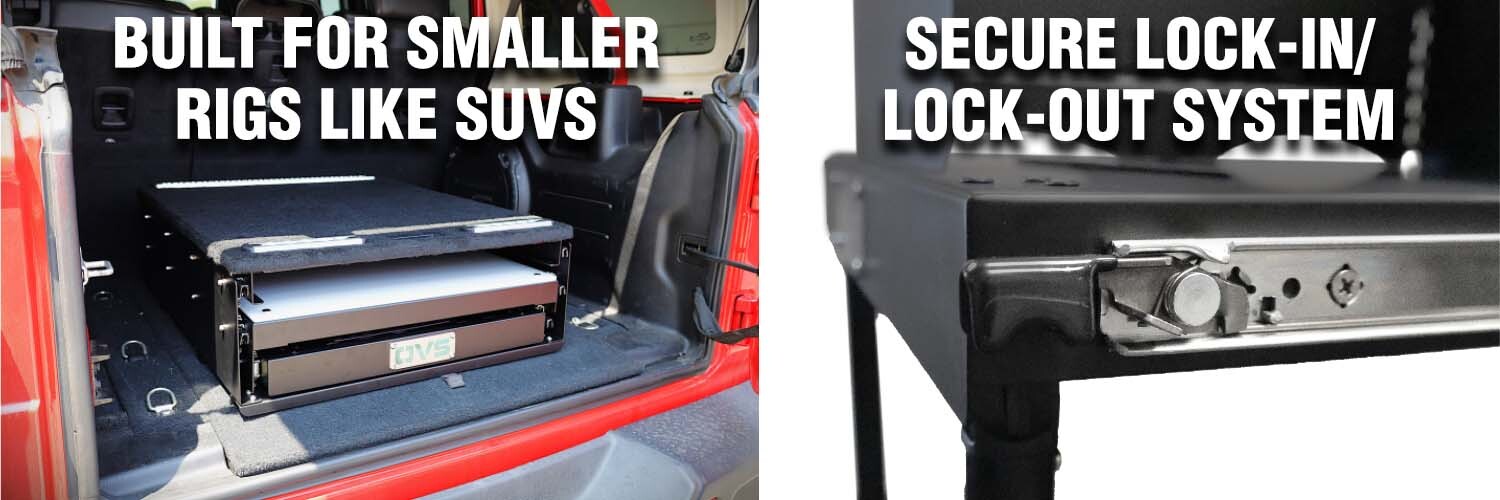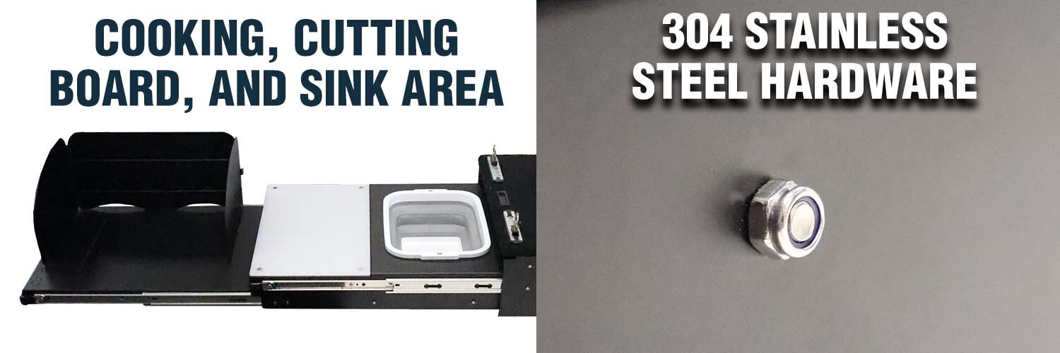 Designed to fit SUVs and mid-size rigs, this kitchen packs down neatly into its lockable cargo box. Each of the 3 heavy-duty slides has a dedicated purpose: