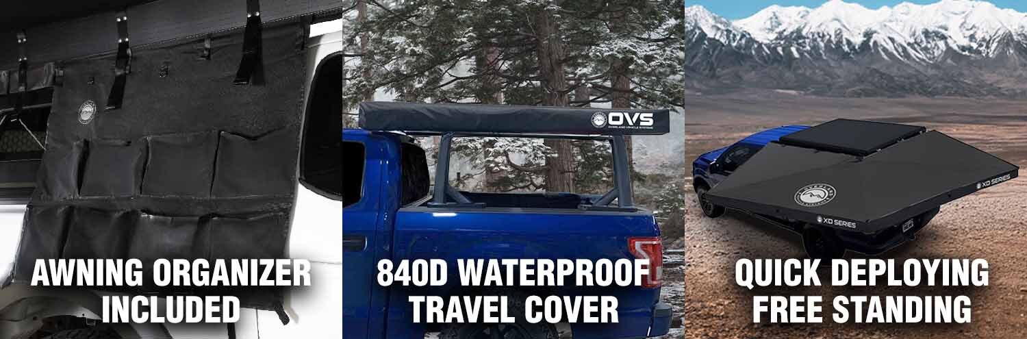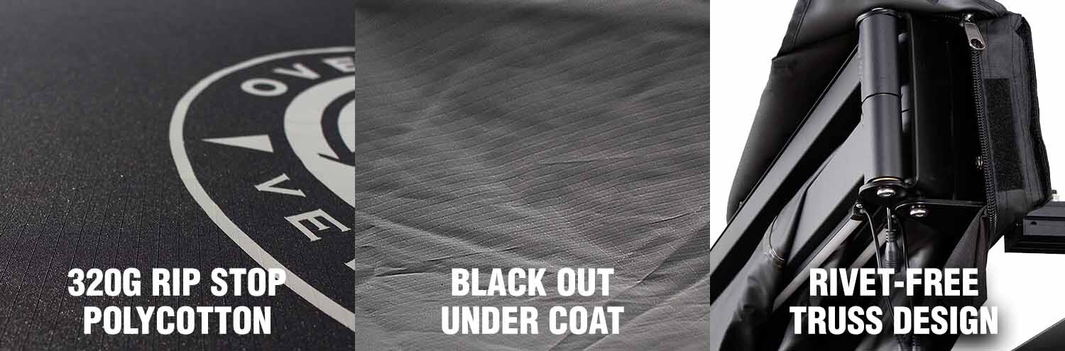 80 sq. ft. of coverage in seconds without the hassle of extra support. Combine that with blackout-coated fabric for cooler shade, waterproof protection, and durable construction, and you’ve got an awning that’s as dependable as your rig.